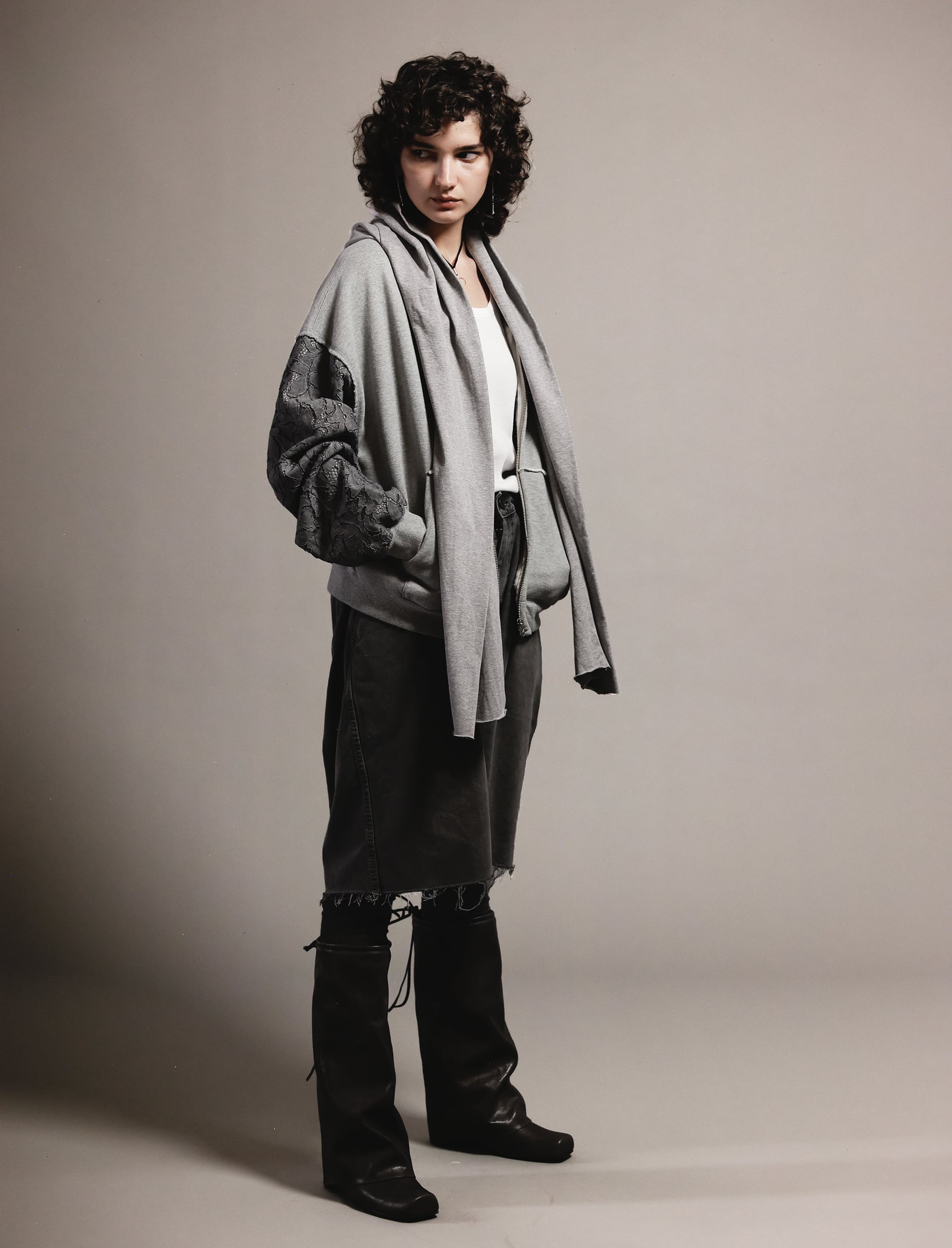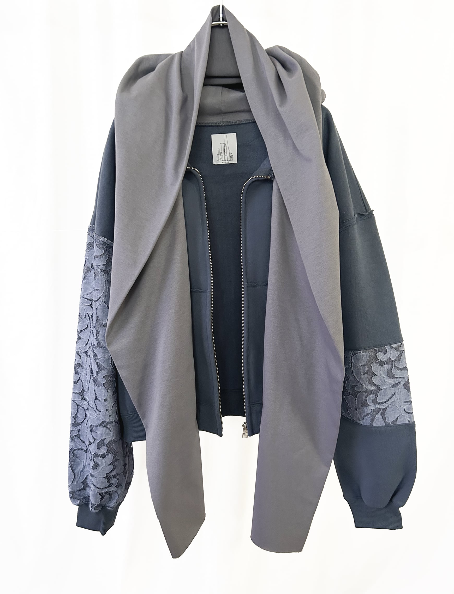 OKIRAKU<stall hoodie printed sweat>は、高級感あふれる上質な天竺素材とスエットを使用した特別な一枚です。袖には顔料で染められたレースを採用し、レースの裏側にはしっかりした柔らかな天竺が重ねられ、心地よい着心地を実現しています。フードとストールが一体型になっているデザインで、背中には幻想的なプリントが施され、視線を引きつけるスタイリッシュな印象を与えます。フロントにはZIPが付いており、レイヤードスタイルでの着こなしも楽しめるでしょう。大きなフードはカジュアルながらも洗練された魅力を引き立て、日常のコーディネートに華やかなエッセンスを加えてくれます。これを身に着けて、特別なスタイルを楽しんでみてはいかがでしょうか?