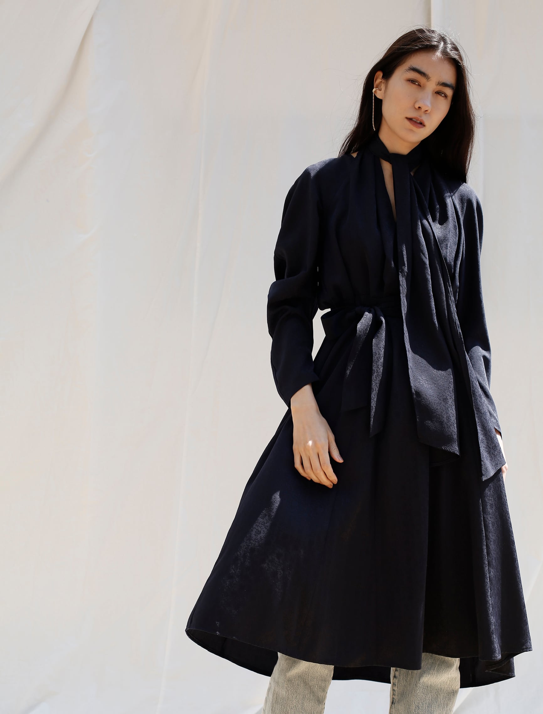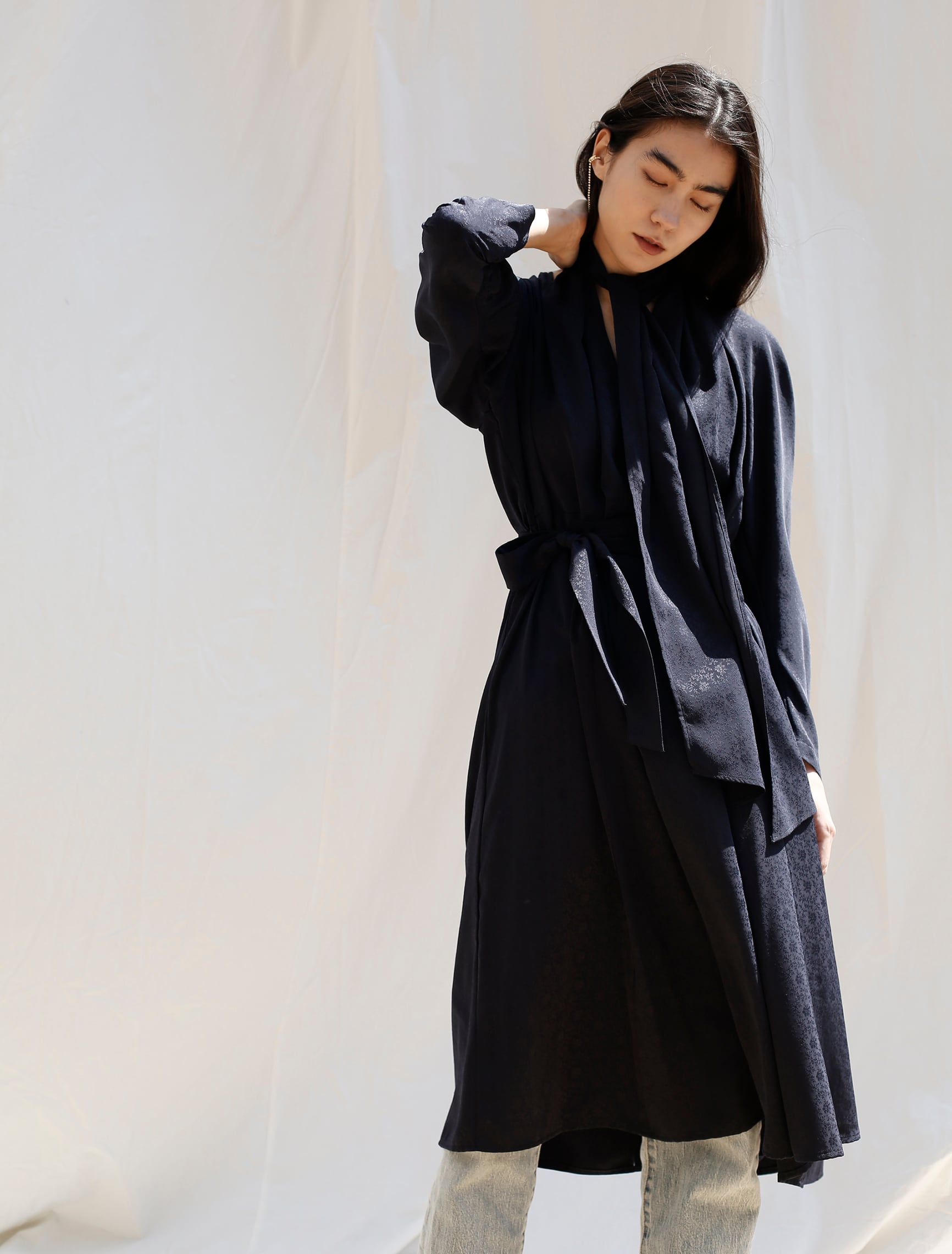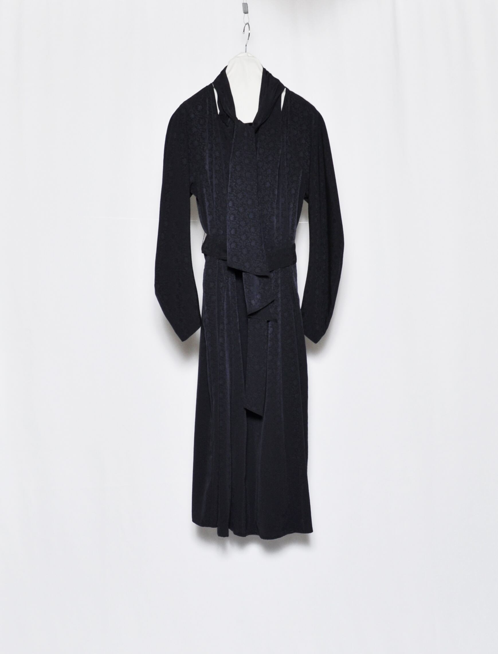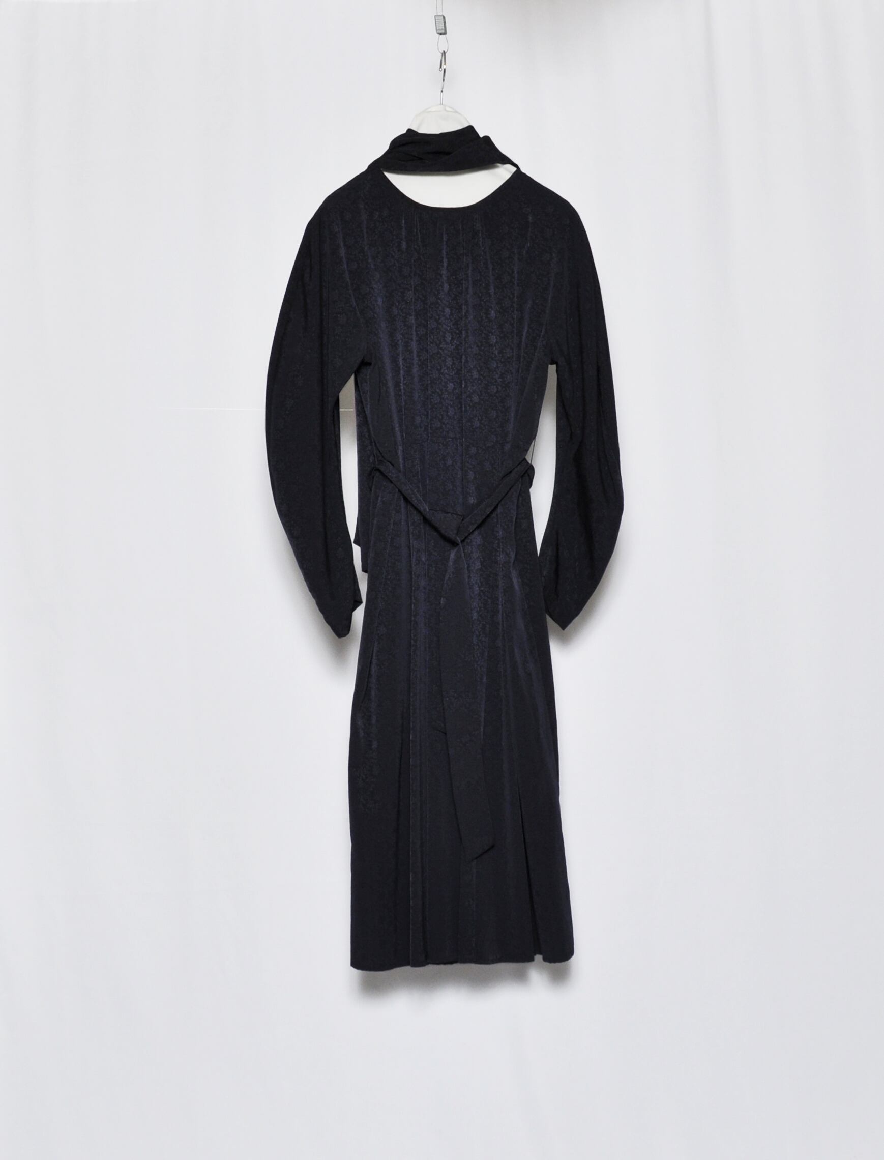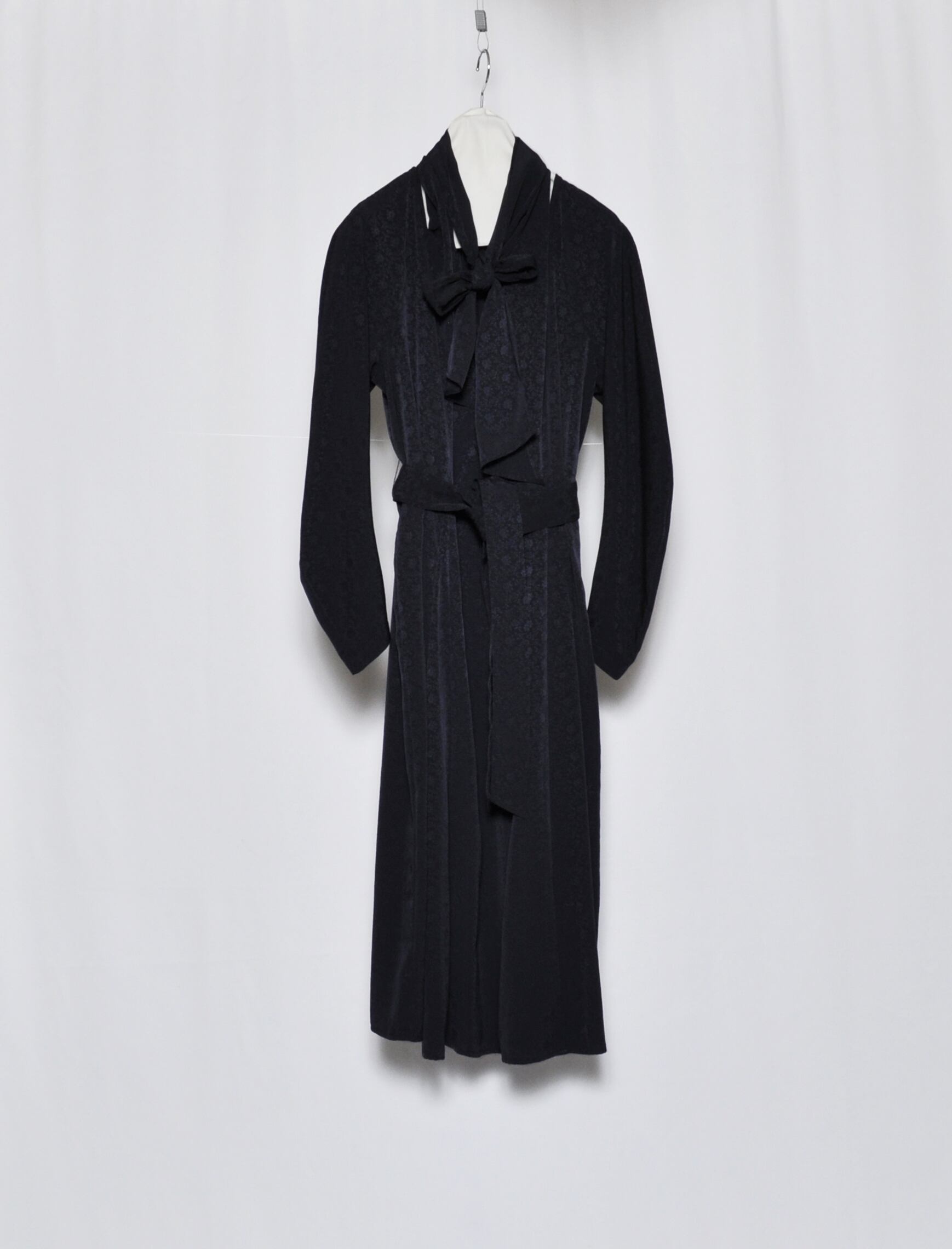 小花模様がほんのり見え隠れするジャガード素材を使用したワンピースです。とろみのある質感でボウタイを結んでも程よく落ち着きます。ボウタイは結んだり襟元に巻いたりとアレンジ次第で色々なスタイルが楽しめます。両前面で着用可能なWフェイススタイル。